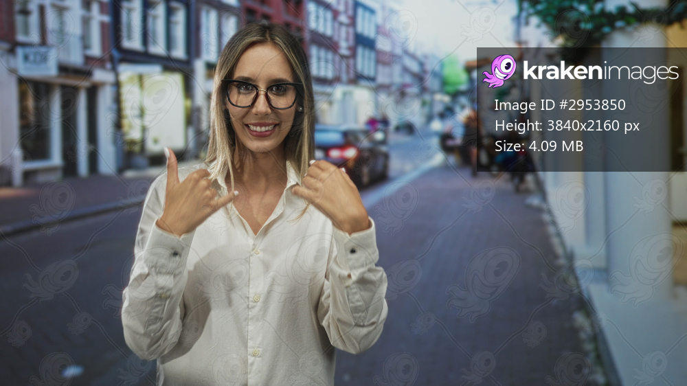 Woman wearing glasses and a white shirt shows hands and smiles while gesturing on a busy city street; confidence approachable.