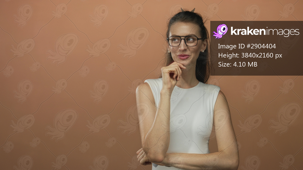 Woman wearing glasses and a white sleeveless top, hand on chin and folded arm in studio with terracotta backdrop; thoughtful reflection.