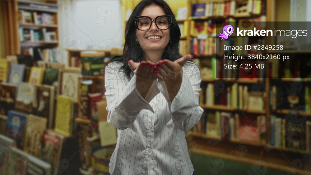 Woman wearing glasses and a white striped shirt blowing a kiss with her hands amid bookstore shelves; connection intimacy closeness affection.