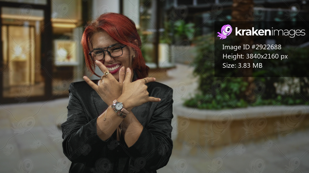 Woman wearing glasses and a wristwatch, smiling with hands crossed and making rock horns gesture in shopping building at night; playful.