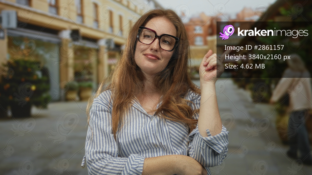 Woman wearing glasses with arms crossed on street lined with shops and holiday decorations; confidence.