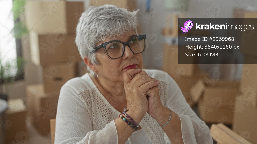 Woman wearing glasses and beaded bracelets rests chin on clasped hands among packed moving boxes in a building filled with natural light; quiet contemplation. - Kraken Images