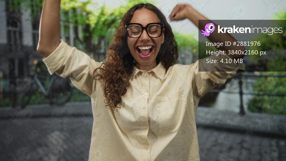 Woman wearing glasses and beige shirt, arms raised with closed eyes smiling on street in amsterdam; joy celebration travel.