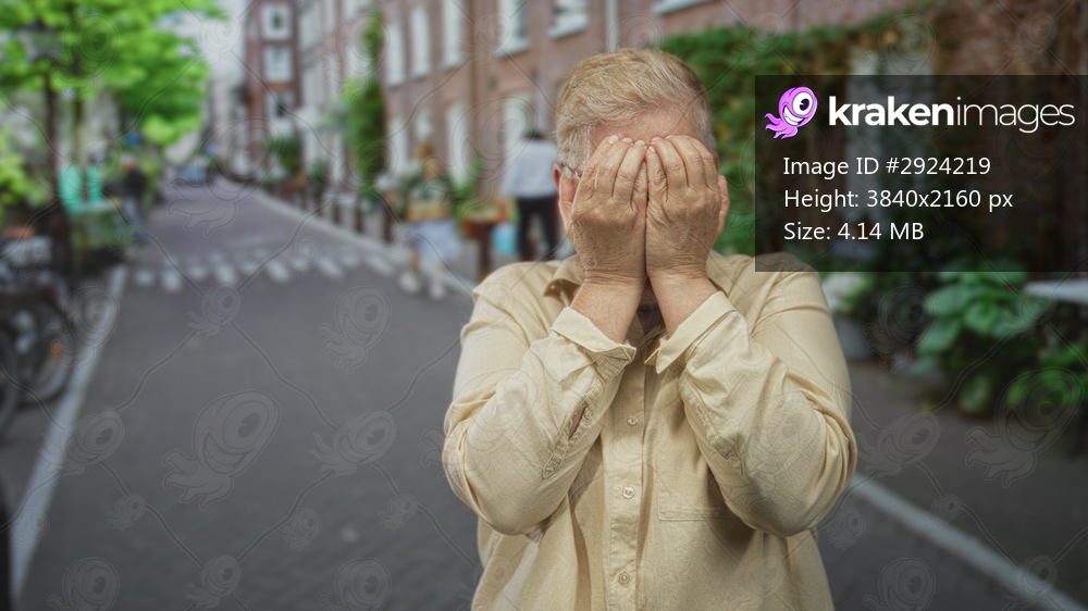 Woman wearing glasses and beige shirt with hands framing open mouth shouting on a narrow cobblestone city street; playful surprise.