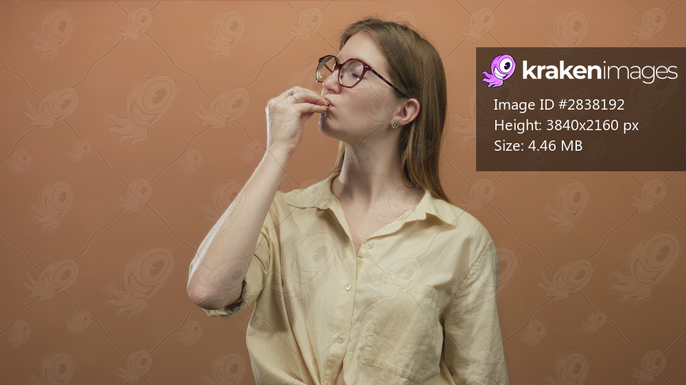 Woman wearing glasses and beige shirt pinches fingers to lips against brown studio background; satisfaction.