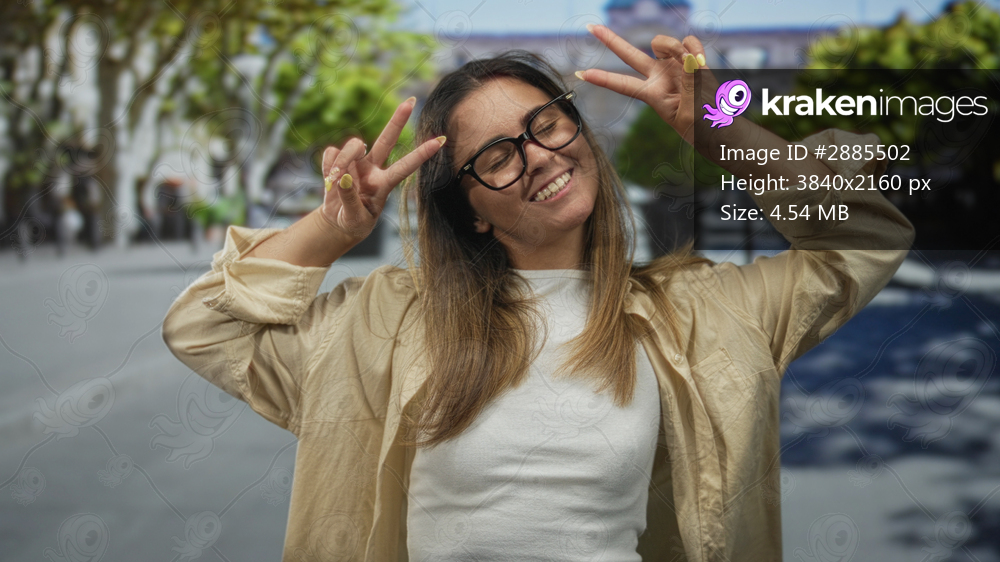Woman wearing glasses and beige shirt smiling and flashing peace sign with hands on sunny city street; playful joy.
