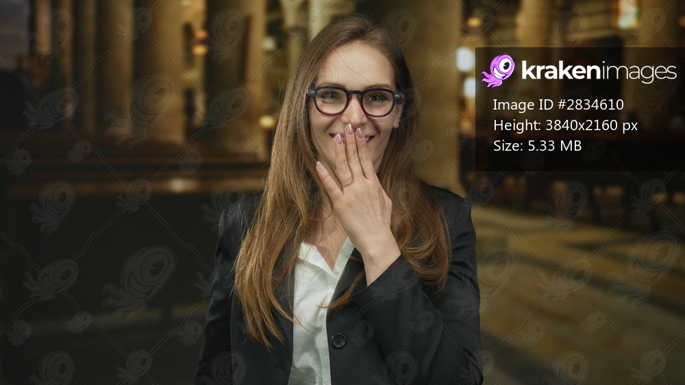 Woman wearing glasses and black blazer covering mouth with hand and smiling near wooden pew in church building interior; joy.
