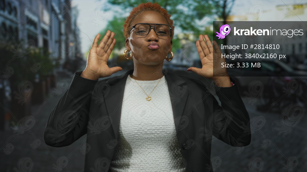 Woman wearing glasses and black blazer holds hands near face gesture on city street with parked cars and bicycles; joy.