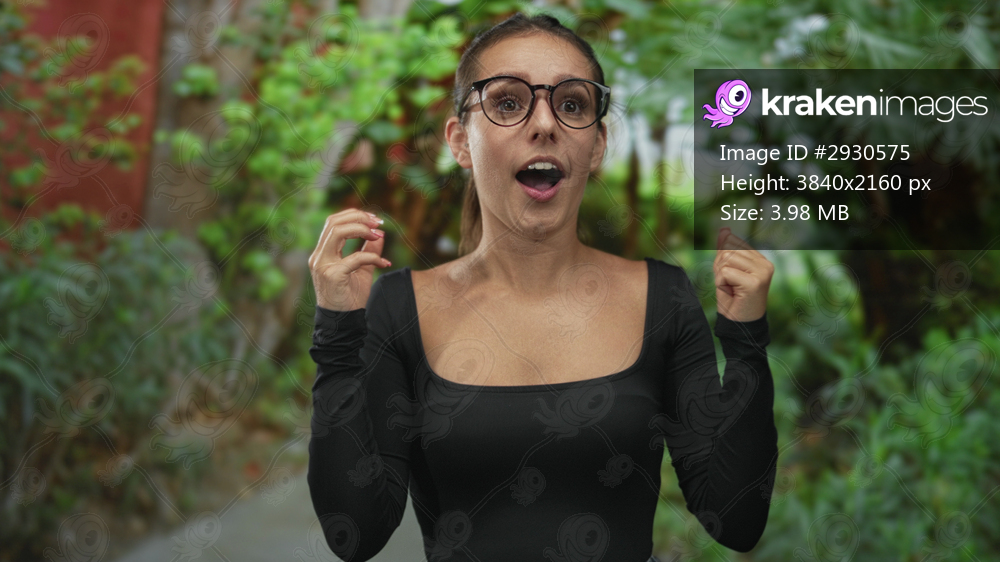 Woman wearing glasses and black off shoulder top with clenched fists near chest on a green park pathway, smiling and looking upward; excitement.