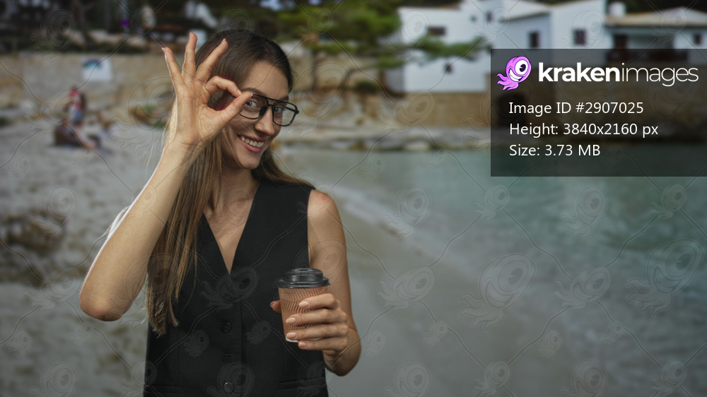 Woman wearing glasses and black vest holding coffee cup makes ok sign around eye while smiling near building by the seaside; vacation joy.