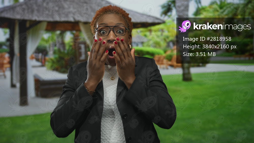 Woman wearing glasses and blazer covers her mouth with both hands against a building wall under bright daylight; surprise.