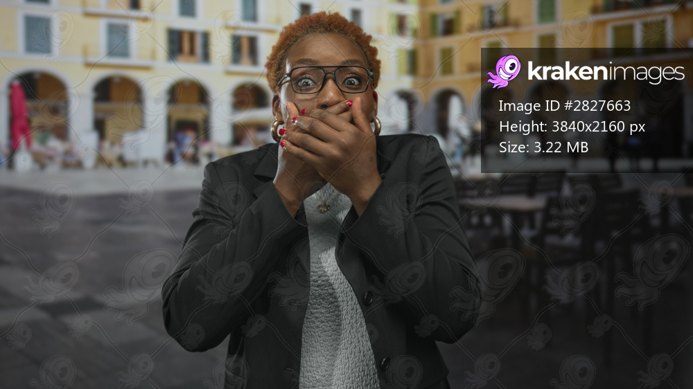 Woman wearing glasses and blazer holding hands on cheeks with mouth open on city street with tables and archways; amazement.