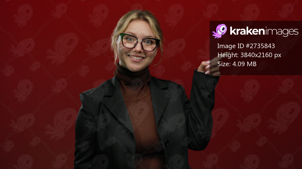 Woman wearing glasses and blazer pointing with expression against a red wall, showcasing professional and confident demeanor in an isolated setting.