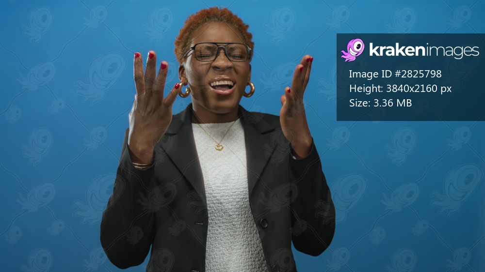 Woman wearing glasses and blazer raises hands beside head with eyes closed and mouth open in blue studio; frustration.