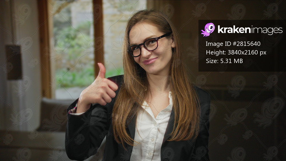 Woman wearing glasses and blazer showing a thumbs up gesture in a living room by a window; confidence.