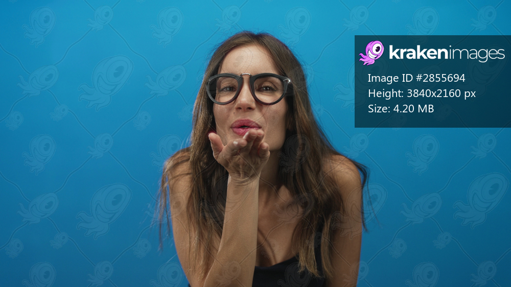 Woman wearing glasses blowing kiss with hand to lips with a gentle smile in studio against a blue wall; affection intimacy tenderness joy.