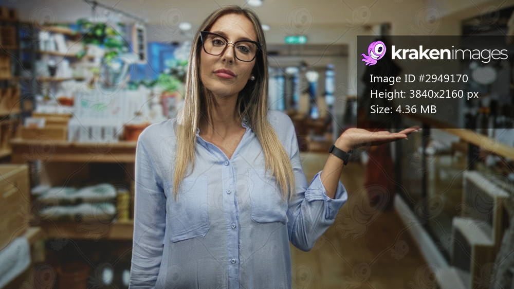 Woman wearing glasses and blue blouse holds right hand palm up in a bright home decor shop inside a building aisle; skepticism.