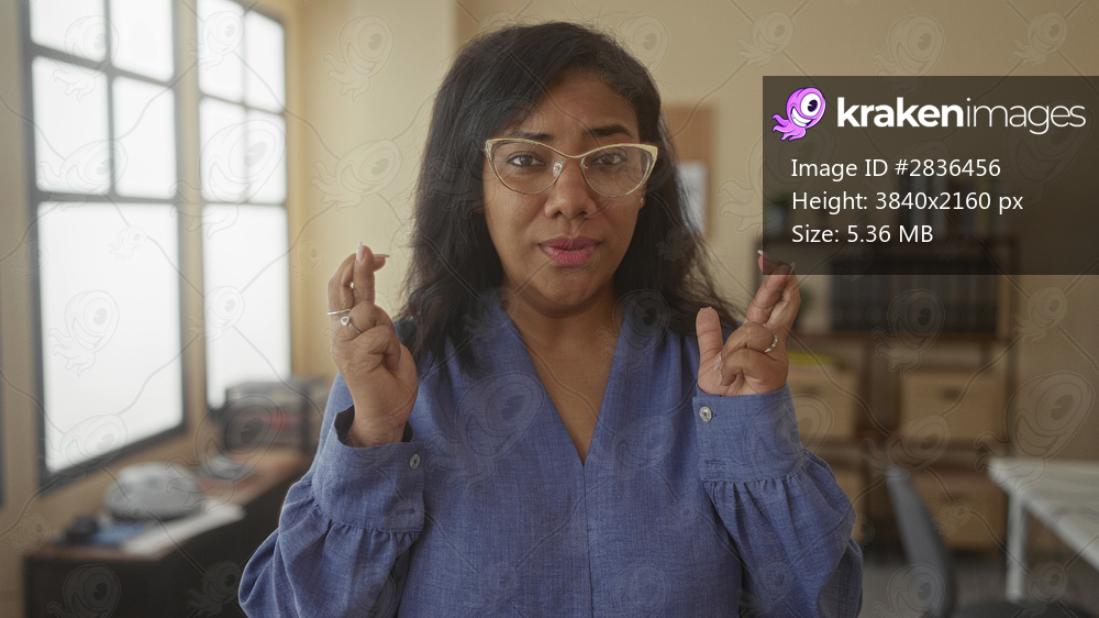 Woman wearing glasses and blue blouse showing crossed fingers gesture inside building with closed eyes and a hopeful smile; hope faith.