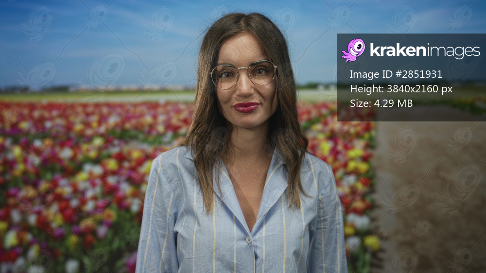 Woman wearing glasses and blue blouse smiles among colorful tulip blooms in forest clearing; serenity.