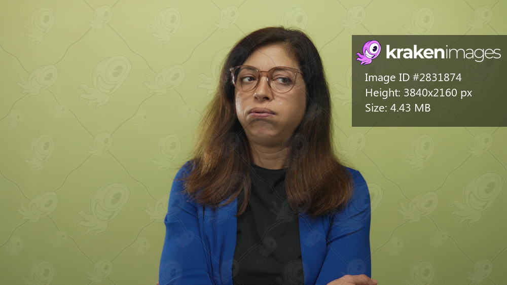 Woman wearing glasses and blue cardigan crosses arms in studio setting against pale green wall; denial.