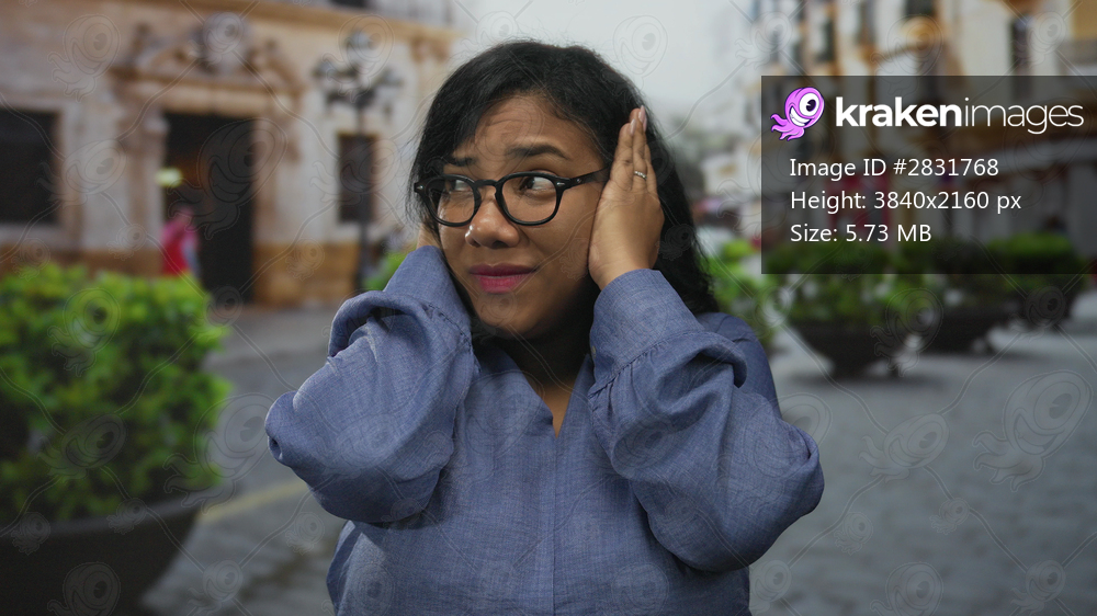 Woman wearing glasses and blue shirt covering ears and closing eyes on busy city street; stress overload.