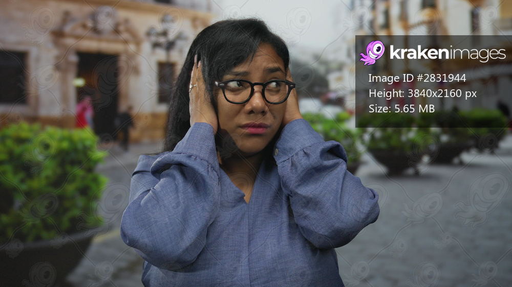 Woman wearing glasses and blue shirt covering ears and closing eyes on busy city street; stress overload.