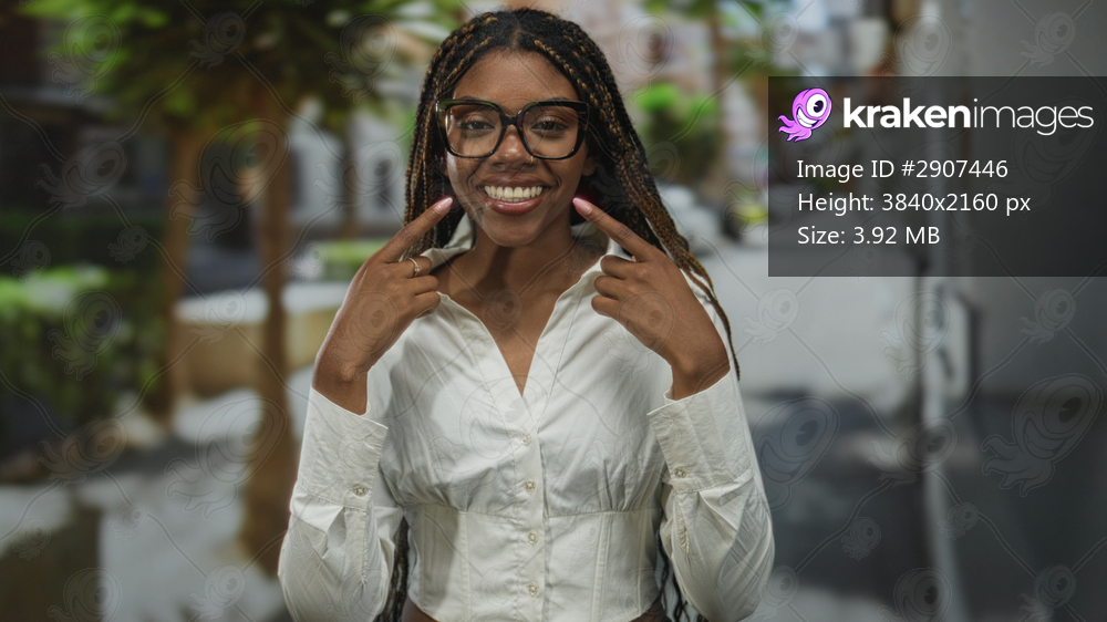 Woman wearing glasses and braids points fingers to cheeks and smiles in white blouse on a city street; joy confidence.