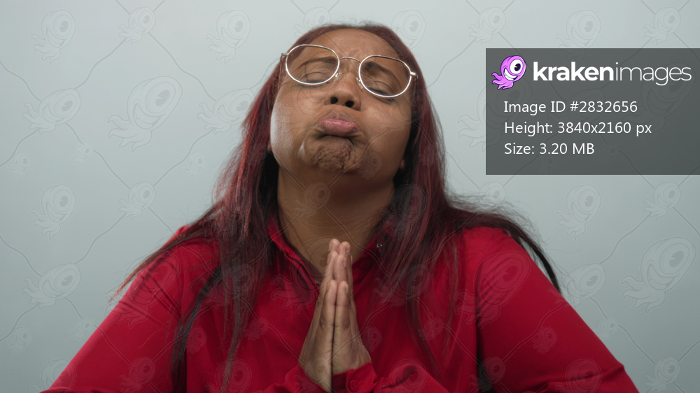 Woman wearing glasses and bright red shirt praying hands to chest in studio under gray backdrop; hope.