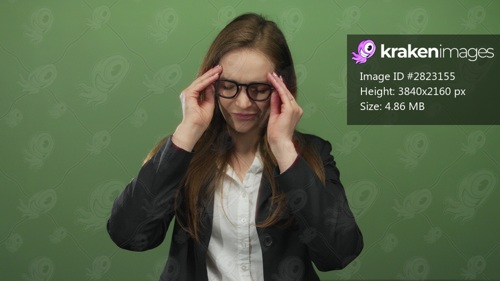Woman wearing glasses and business suit with hand on forehead against green wall in studio; stress fatigue tension.