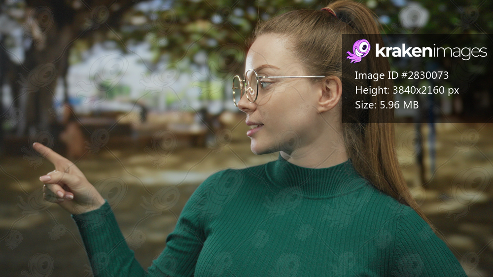 Woman wearing glasses and casual green sweater pointing finger upward in park setting with blurred trees benches and sunlit grass; curiosity.