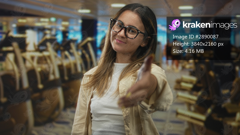 Woman wearing glasses and casual shirt extends her hand for a handshake in a gymnasium filled with treadmills and equipment; friendly welcome.