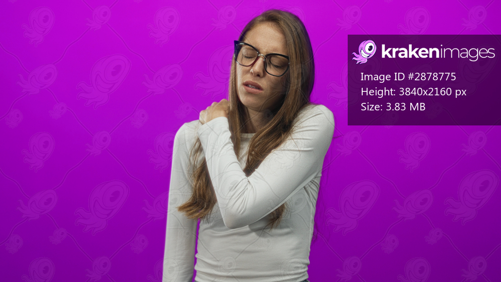 Woman wearing glasses clutching shoulder in magenta studio with white shirt and long hair visible; pain tension.