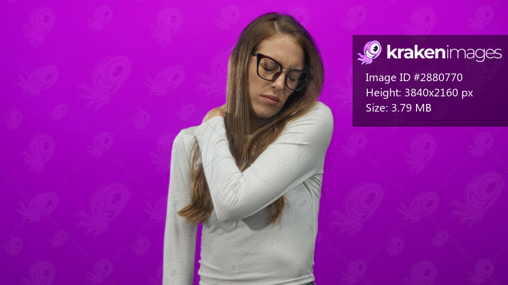 Woman wearing glasses clutching shoulder in magenta studio with white shirt and long hair visible; pain tension.