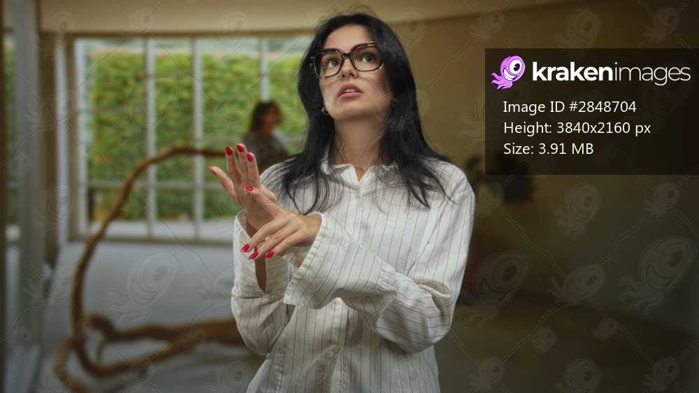 Woman wearing glasses counts fingers near wooden sculpture in building; calculation concentration strategy planning.