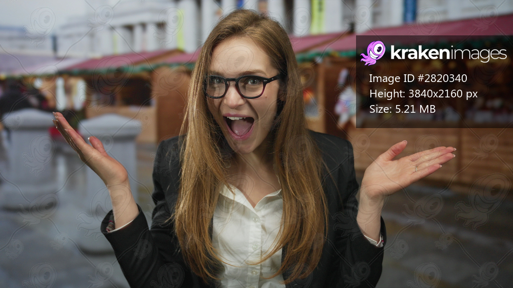 Woman wearing glasses covers eyes with hands in street market stalls of bright wooden souvenirs; surprise.