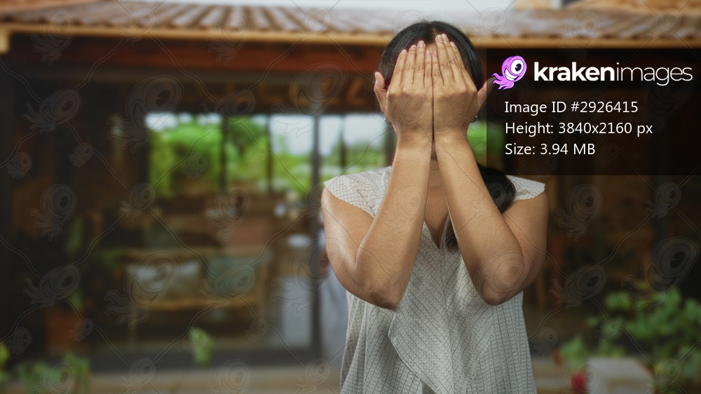 Woman wearing glasses covers face with hands at building entrance, peeking and smiling through fingers beside house doorway on a porch; shyness warmth. - Kraken Images