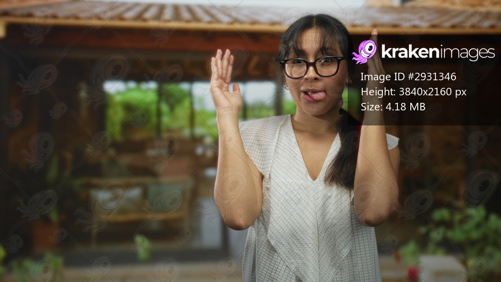 Woman wearing glasses covers face with hands at building entrance, peeking and smiling through fingers beside house doorway on a porch; shyness warmth. - Kraken Images