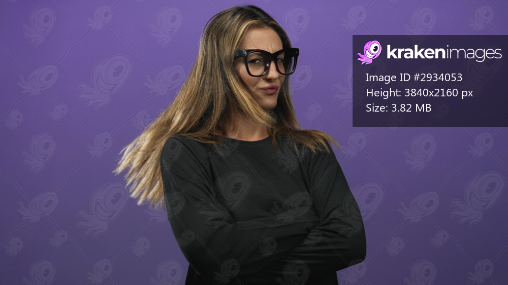 Woman wearing glasses with crossed arms in studio purple wall, young blonde in black top standing center frame; attitude defiance.