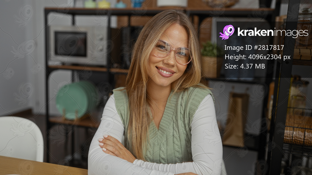 Woman wearing glasses crosses arms on wooden table in living room with kitchen shelving in background; confidence selfassurance positivity.