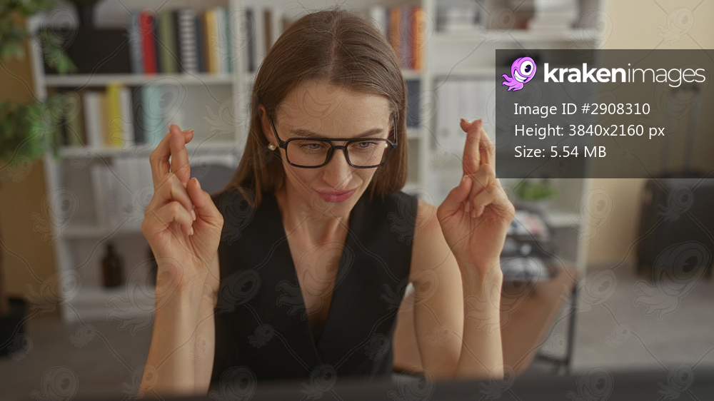 Woman wearing glasses crossing fingers over keyboard and pumping fists while smiling at monitor in building; triumph success.