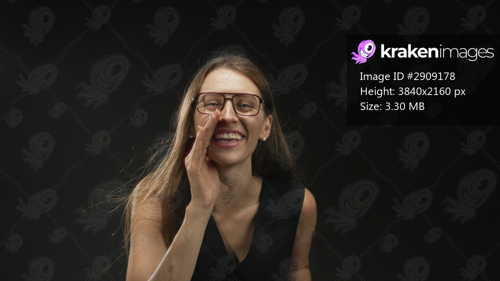 Woman wearing glasses cupping hand to mouth while holding takeaway coffee cup and smiling on black studio backdrop; joy announcement.