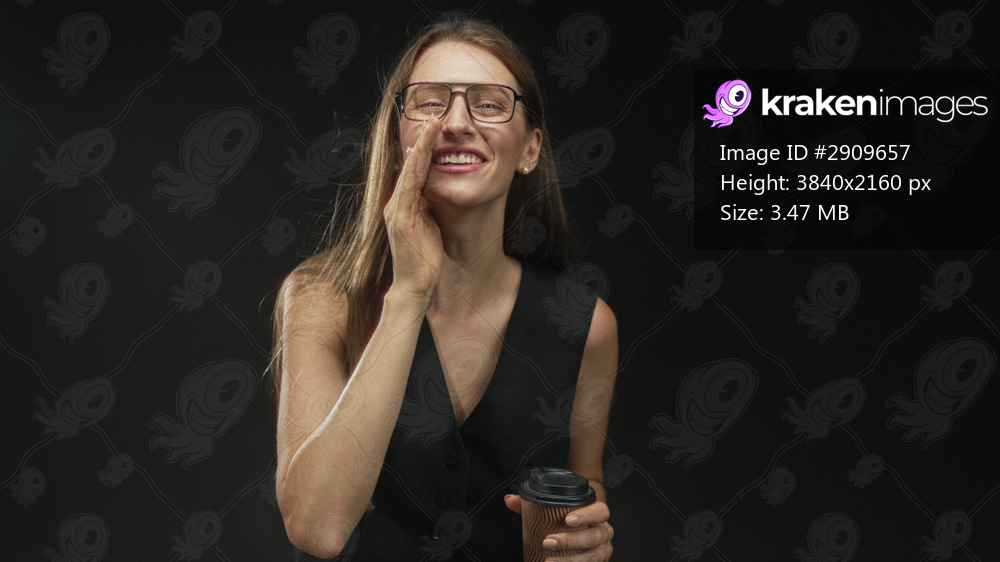 Woman wearing glasses cupping hand to mouth while holding takeaway coffee cup and smiling on black studio backdrop; joy announcement.