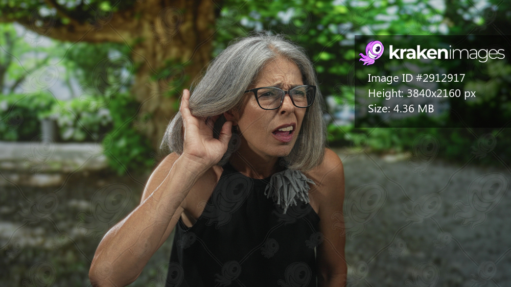 Woman wearing glasses cups hand to ear in a green park by a large tree, wincing and turning head away from sound; hearing difficulty annoyance.
