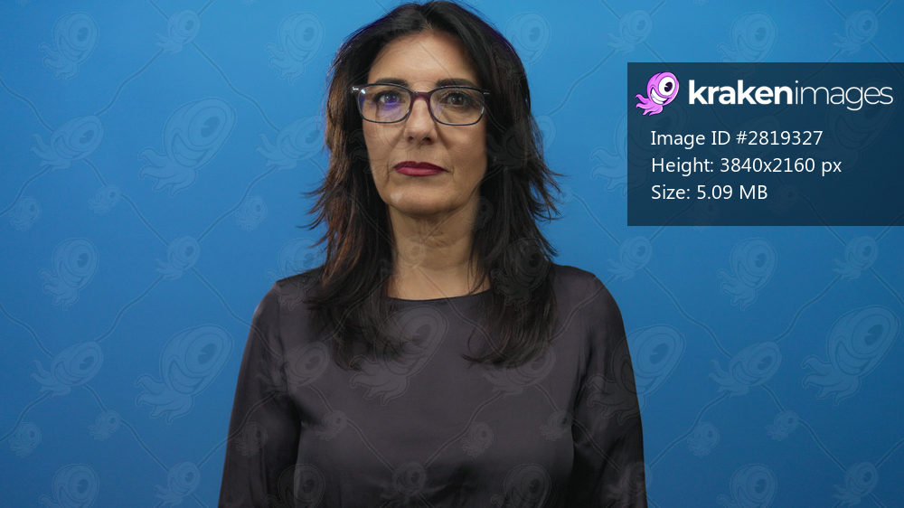 Woman wearing glasses and dark blouse looks forward with neutral expression in blue studio setting; calm introspection.