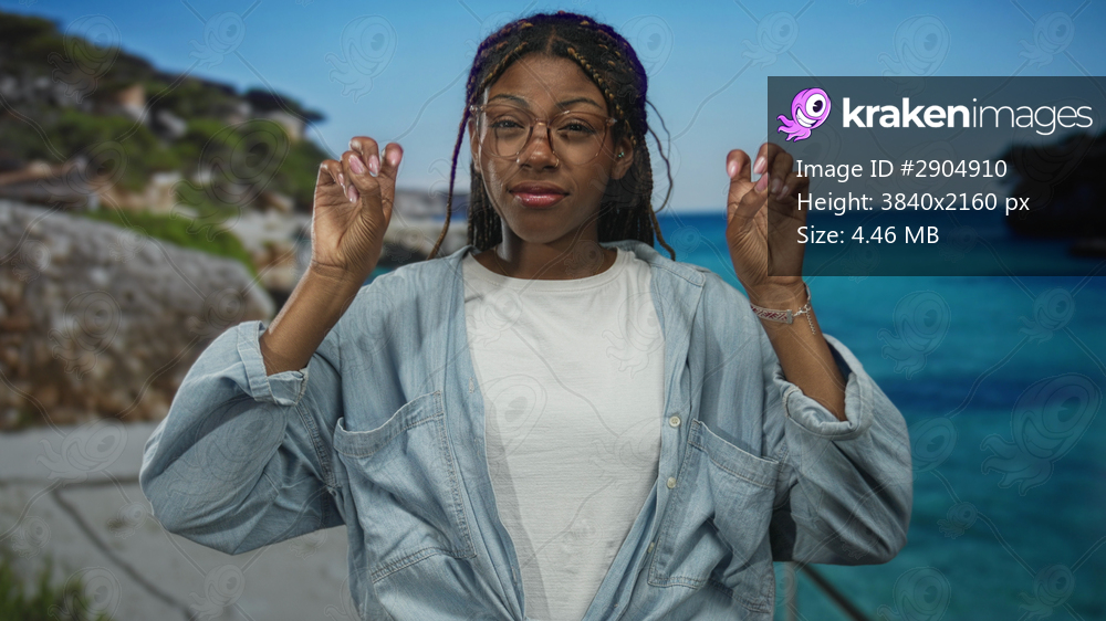 Woman wearing glasses and denim shirt holding hands in air quotes gesture at studio seaside set with turquoise ocean backdrop; skepticism irony.