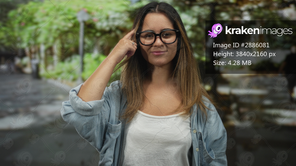 Woman wearing glasses and denim shirt points finger to temple while smiling on a tree lined street; thoughtful insight.