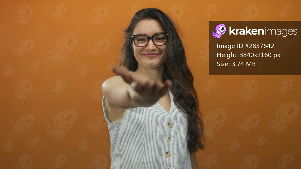 Woman wearing glasses extends bare hand palm up in orange studio shot offering gesture; trust generosity.