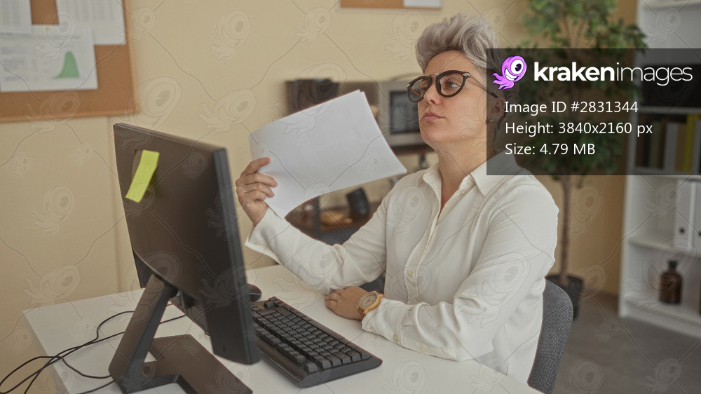 Woman wearing glasses fans face with documents inside modern office building by computer desk; relief.