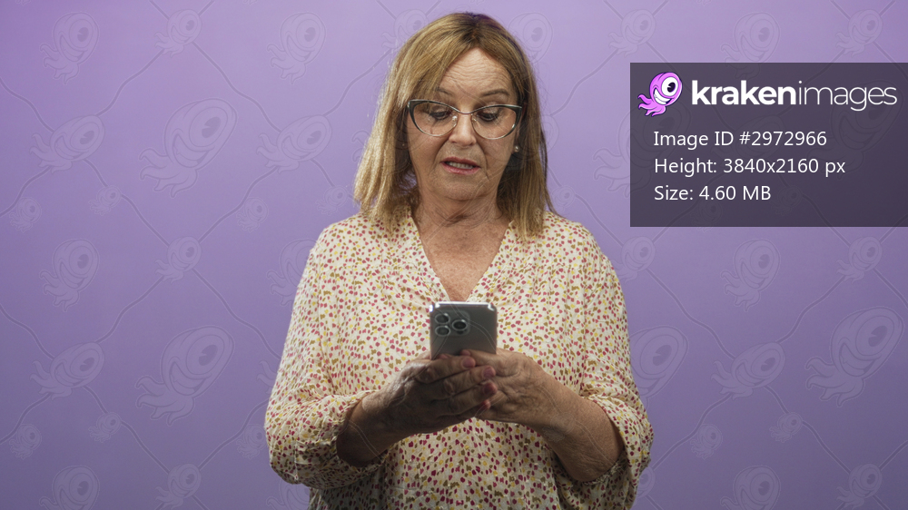 Woman wearing glasses and floral blouse holding smartphone with both hands and looking down in a studio; thoughtful reflection.
