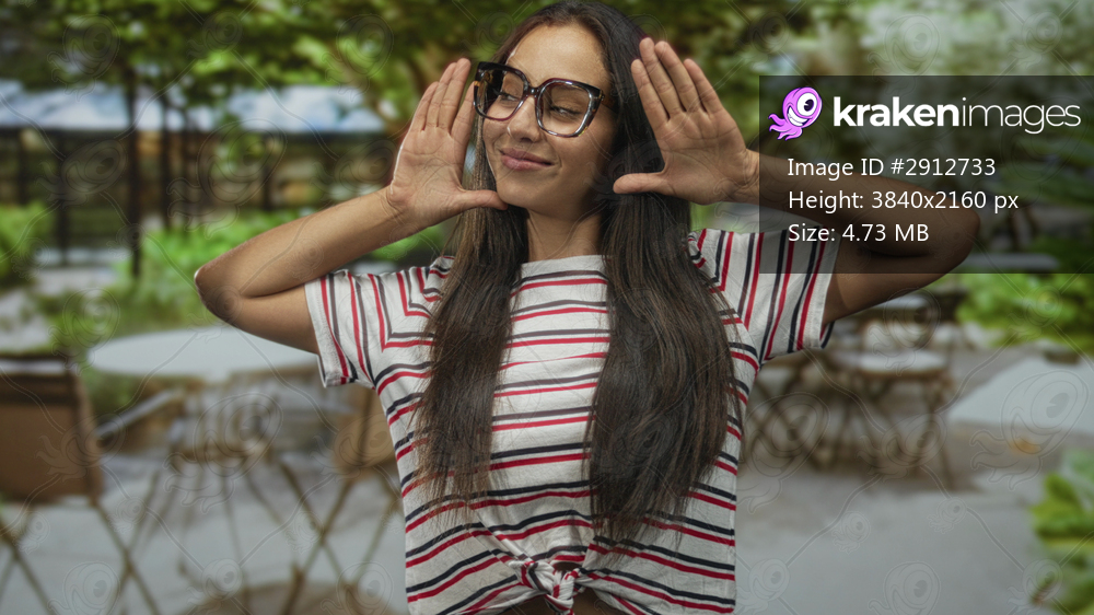 Woman wearing glasses framing face with hands on terrace street cafe outdoors, smiling broadly; playful leisure.